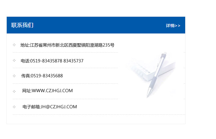 地址:常州市新北區友邦商務大廈1幢16、17層  電話:0519-85101652  傳真:0519-85112595  郵編:213022  網址:www.cz-jiayue_cn.jkr88.com  郵箱:xiajifengaa@163.com